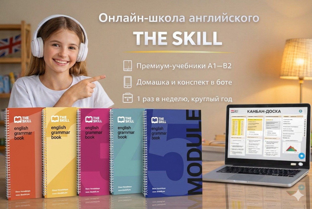THE SKILL это онлайн-школа английского для школьников, где мы строим фундамент и спокойную траекторию A1–B2, чтобы ребёнок учился системно и самостоятельно.